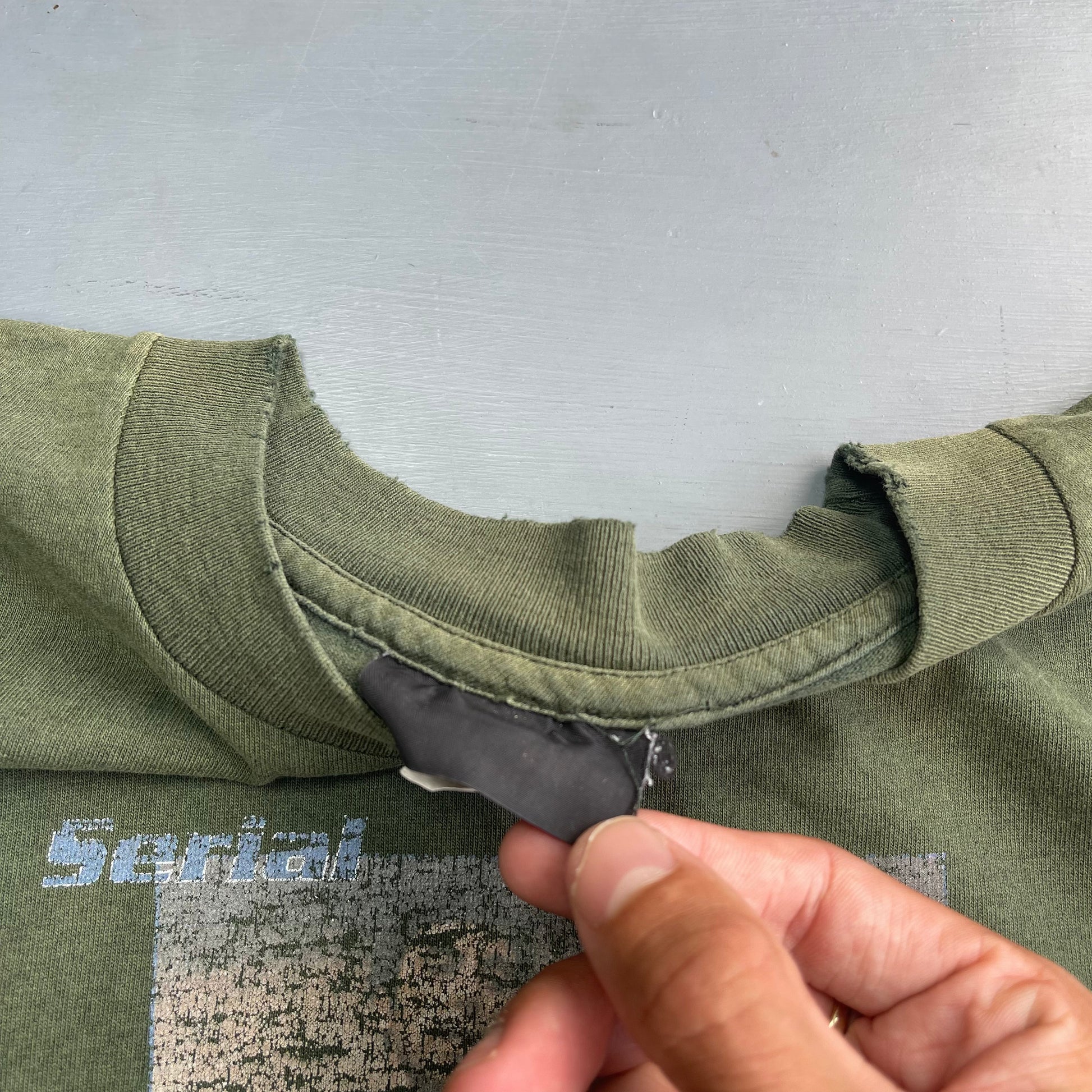 In a worn faded vintage condition with cracking to print and nice discolouring around neck